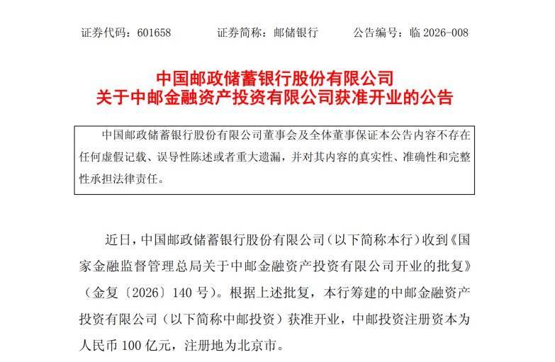 同年10月,邮储银行收到《国家金融监督管理总局关于筹建中邮金融资产投资有限公司的批复》,国家金融监督管理总局同意邮储银行筹建中邮金融资产投资有限公司。筹建工作完成后,邮储银行将按照有关规定和程序向国家金融监督管理总局提出开业申请。